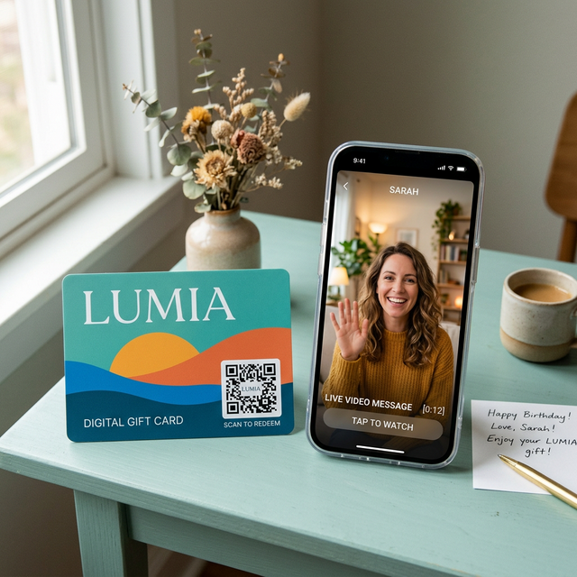 Physical Gift Cards with QR codes or digital E-Gift Cards with video messages. Transform every card into a personal and emotional experience.